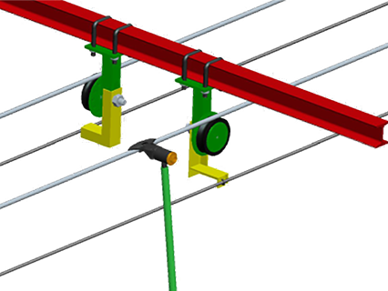 在托輪的下方全線路上設(shè)置一根鋼絲繩,當(dāng)?shù)跻伟l(fā)生過(guò)擺時(shí),防過(guò)擺的鋼絲繩將吊椅擋回去,使吊椅恢復(fù)正常位置。
