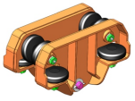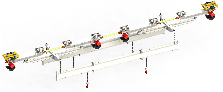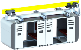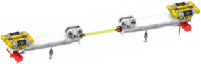 單軌吊速度保護小車設有離心限速裝置和編碼器測速裝置,安裝在電液車和柴油機車主機上方??捎糜趩诬壍醭休d、行走及導向,當機車運行速度超過設計最大運行速度的15%時,控制機車緊急制動。