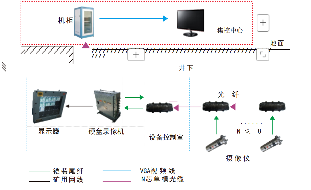 1、控制功能:在運(yùn)輸設(shè)備巷道的機(jī)頭、機(jī)尾等處各安裝1個(gè)(最多不超過(guò)8個(gè))光纖攝像儀,對(duì)監(jiān)控點(diǎn)的情況進(jìn)行實(shí)時(shí)監(jiān)視,硬盤(pán)錄像機(jī)通過(guò)光纖接收視頻信號(hào),通過(guò)顯示器進(jìn)行顯示和切 換,實(shí)現(xiàn)地面和井下視頻信號(hào)實(shí)時(shí)顯示和存儲(chǔ)的目的。