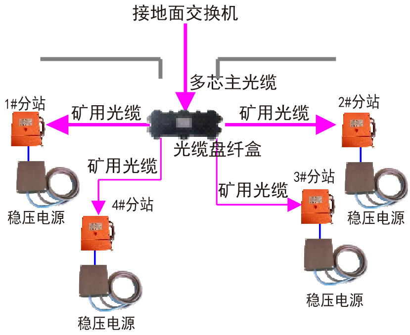 ◆ 多芯主光纜直接連接至地面交換機(jī),利用光纜盤(pán)纖盒分支連接至分站。