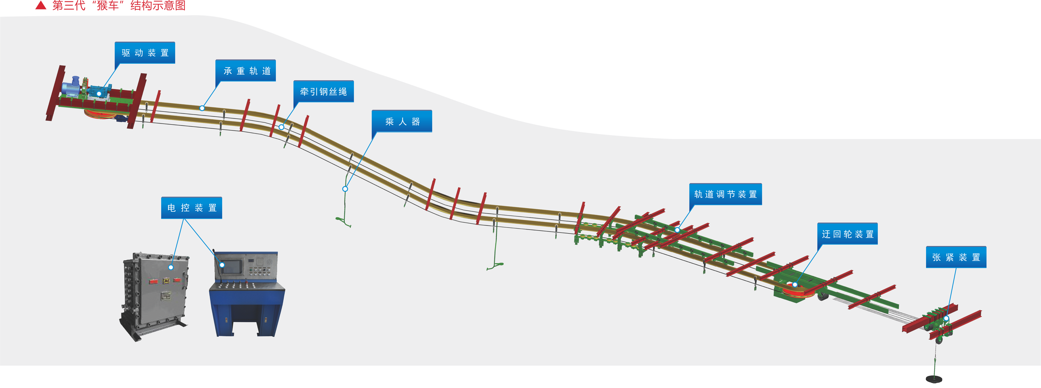 礦用繩牽引軌道式架空乘人裝置是傳統(tǒng)“猴車”更新?lián)Q代的產(chǎn)品。它主要由驅(qū)動(dòng)裝置、承重軌 道、牽引鋼絲繩、乘人器、迂回輪裝置、軌道調(diào)節(jié)裝置、張緊裝置、安全保護(hù)裝置及電控裝置等組 成。具有不掉繩、防脫繩、適用于大坡度多個(gè)同向彎或“S”型彎的巷道條件;且運(yùn)量大、乘坐更舒適、安全性能更高,是一種新型的現(xiàn)代化礦山井下人員輸送設(shè)備。