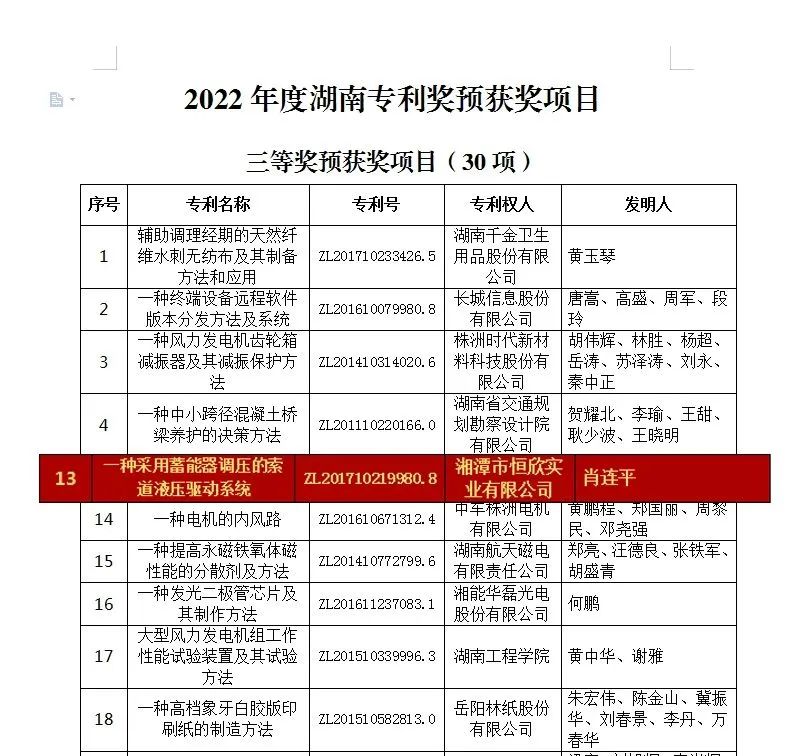 3月23日,湖南省市場(chǎng)監(jiān)督管理局發(fā)布《2022年度湖南專利獎(jiǎng)評(píng)審結(jié)果公示》,【恒欣股份】發(fā)明專利“一種采用蓄能器調(diào)壓的索道液壓驅(qū)動(dòng)系統(tǒng)”獲得湖南省專利獎(jiǎng)三等獎(jiǎng)。