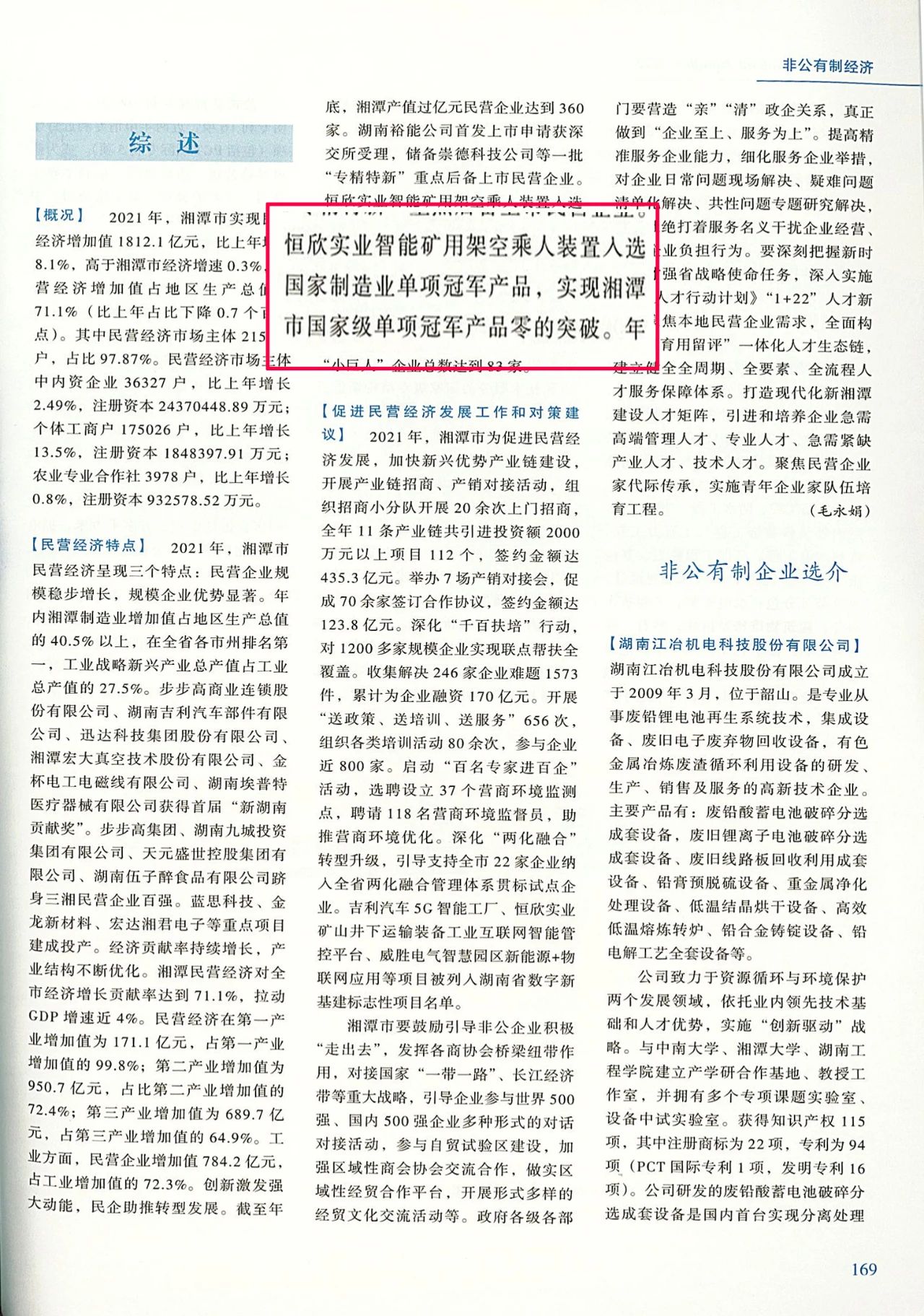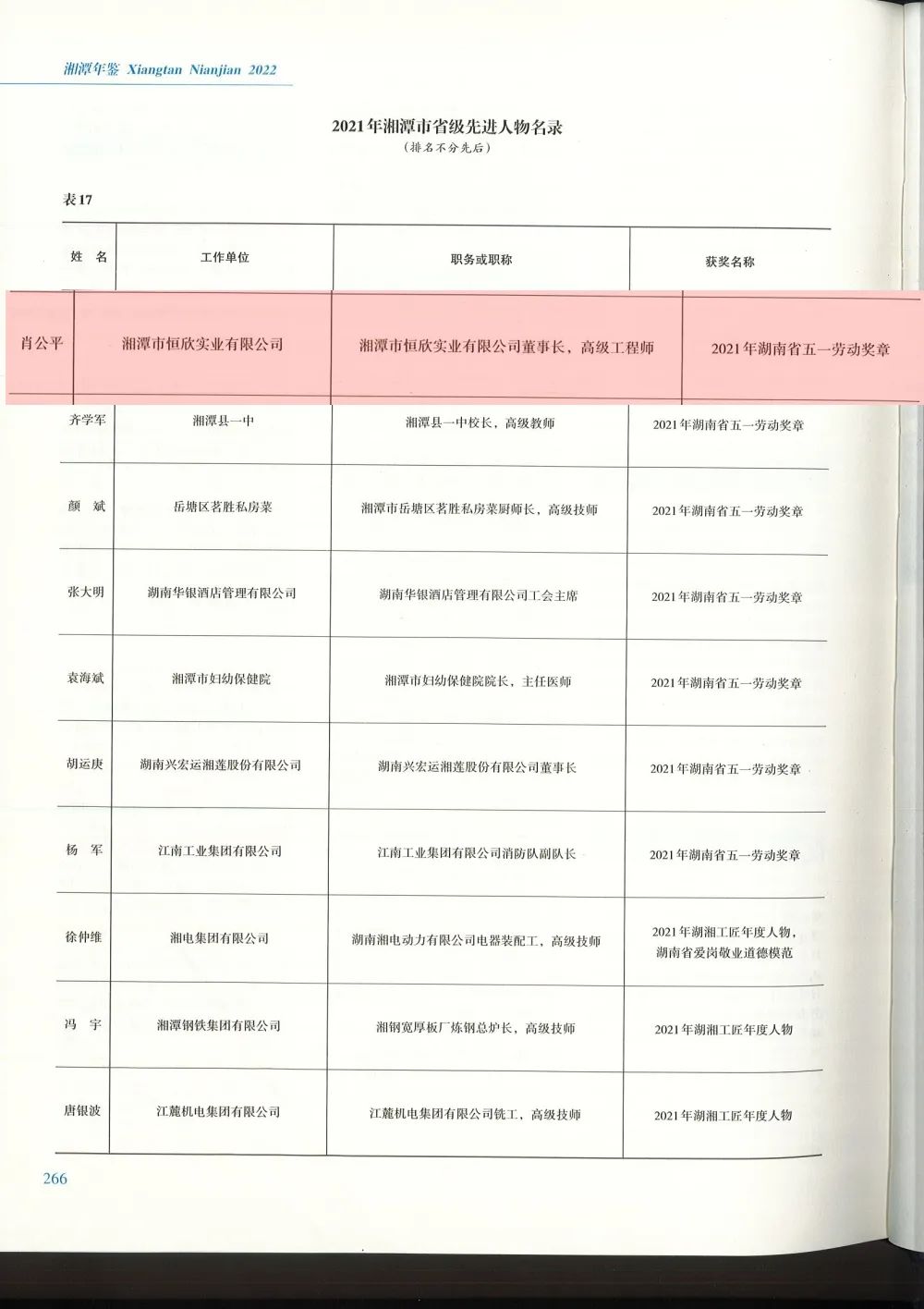 2022年出版的《湘潭年鑒》多個(gè)章節(jié)收錄了【恒欣股份】在科學(xué)技術(shù)、經(jīng)濟(jì)發(fā)展等方面取得的成績,董事長肖公平榮獲2021年湖南省五一勞動(dòng)獎(jiǎng)?wù)卤?/span>收錄在《湘潭年鑒》"2021年湘潭市省級先進(jìn)人物名錄“中。