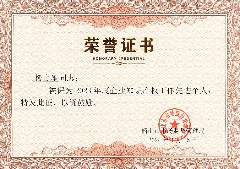 4月26日,韶山市委宣傳部和韶山市市場(chǎng)監(jiān)督管理局等單位聯(lián)合主辦了韶山市2024年“知識(shí)產(chǎn)權(quán)宣傳周”主題活動(dòng)?;顒?dòng)現(xiàn)場(chǎng)上,由韶山市委常委、副市長(zhǎng)鄒正光為榮獲知識(shí)產(chǎn)權(quán)榮譽(yù)的企業(yè)和個(gè)人進(jìn)行頒獎(jiǎng)和授牌。董事長(zhǎng)肖公平接受鄒副市長(zhǎng)為【恒欣股份】獲評(píng)國(guó)家知識(shí)產(chǎn)權(quán)示范企業(yè)的授牌,【恒欣股份】知識(shí)產(chǎn)權(quán)辦主任楊自攀被評(píng)為企業(yè)知識(shí)產(chǎn)權(quán)工作先進(jìn)個(gè)人。