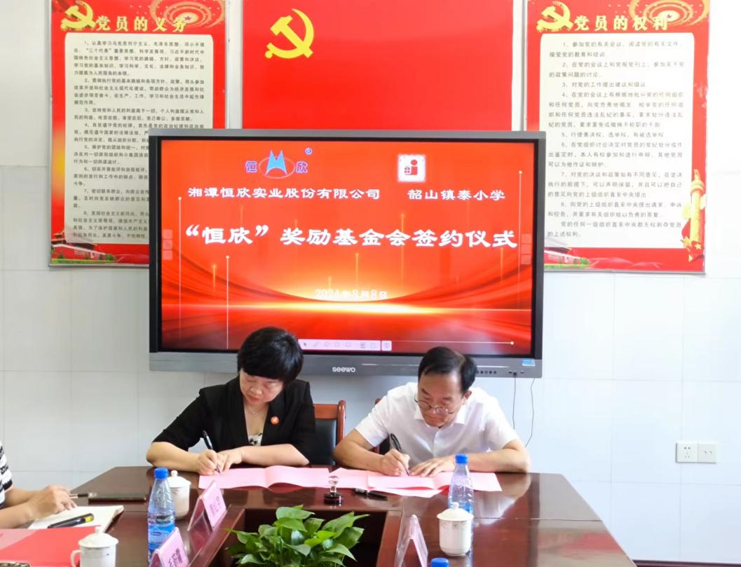 2024年8月8日,【恒欣股份】與韶山鎮(zhèn)泰小學(xué)就共同成立“恒欣”獎(jiǎng)勵(lì)基金會(huì)舉行簽約儀式。韶山市委副書(shū)記劉志剛、韶山市教育局副書(shū)記、副局長(zhǎng)張賽、【恒欣股份】董事長(zhǎng)肖公平、總經(jīng)理肖龍武等出席簽約儀式,儀式由韶山市教育局原副局長(zhǎng)胡勇衛(wèi)主持。