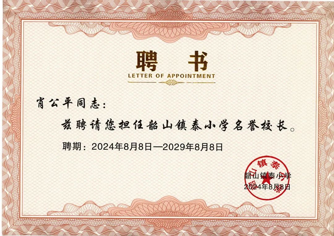 韶山市委副書(shū)記劉志剛對(duì)此次合作給予了高度評(píng)價(jià),對(duì)【恒欣股份】的愛(ài)心表示感謝。由韶山市教育局副書(shū)記、副局長(zhǎng)張賽為肖董事長(zhǎng)頒發(fā)了鎮(zhèn)泰小學(xué)“名譽(yù)校長(zhǎng)”的聘書(shū)。