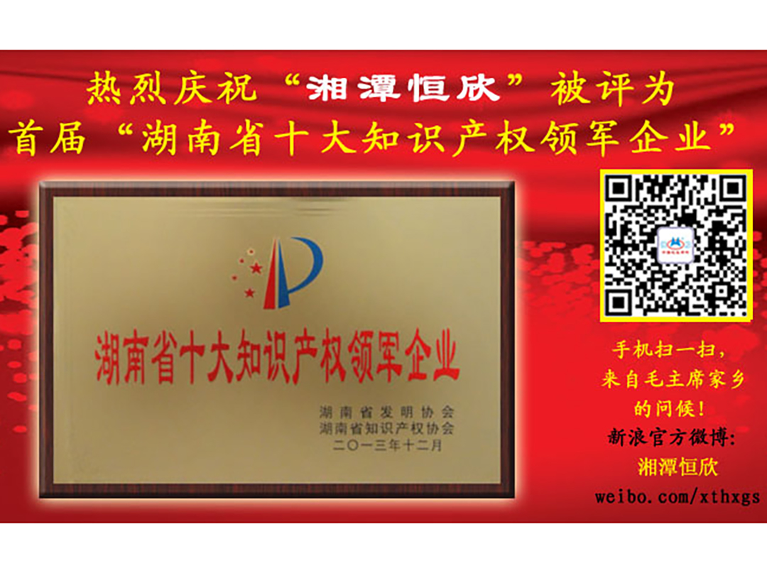 xiao12666@163.com熱烈慶祝“湘潭恒欣”被評為“首屆湖南省十大知識產(chǎn)權(quán)領(lǐng)軍企業(yè)”