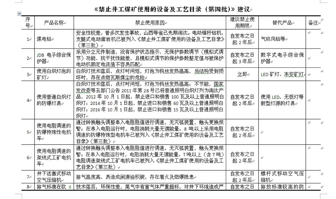 《禁止井工煤礦使用的設(shè)備及工藝目錄(第四批)》建議