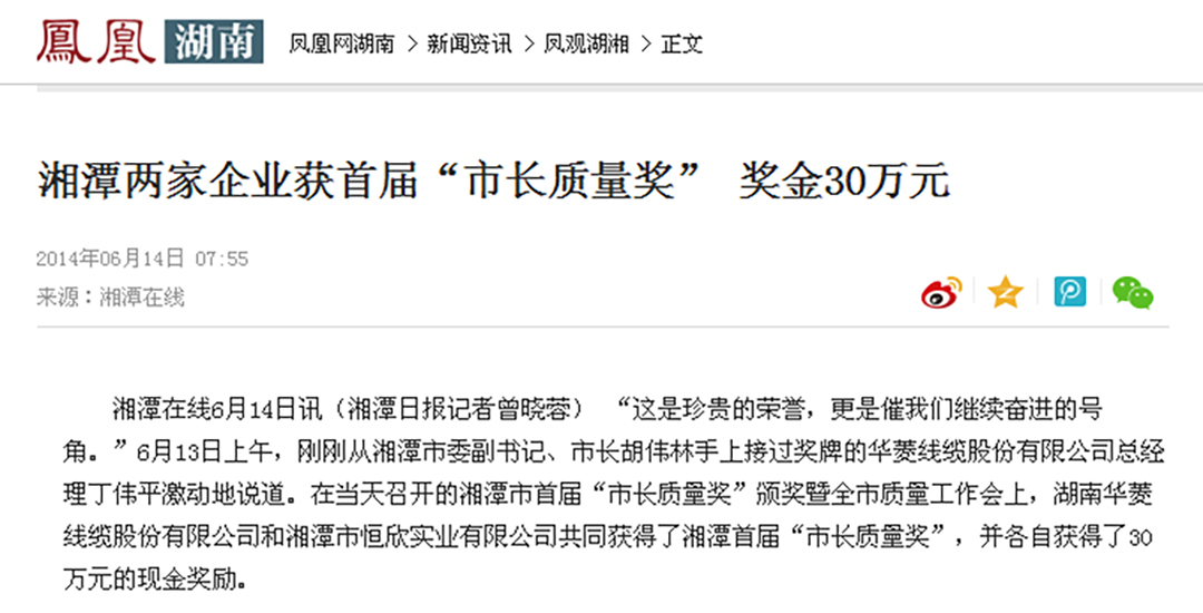 鳳凰網(wǎng)、紅網(wǎng)隆重報道:“湘潭恒欣”榮獲湘潭市首屆“市長質量獎”