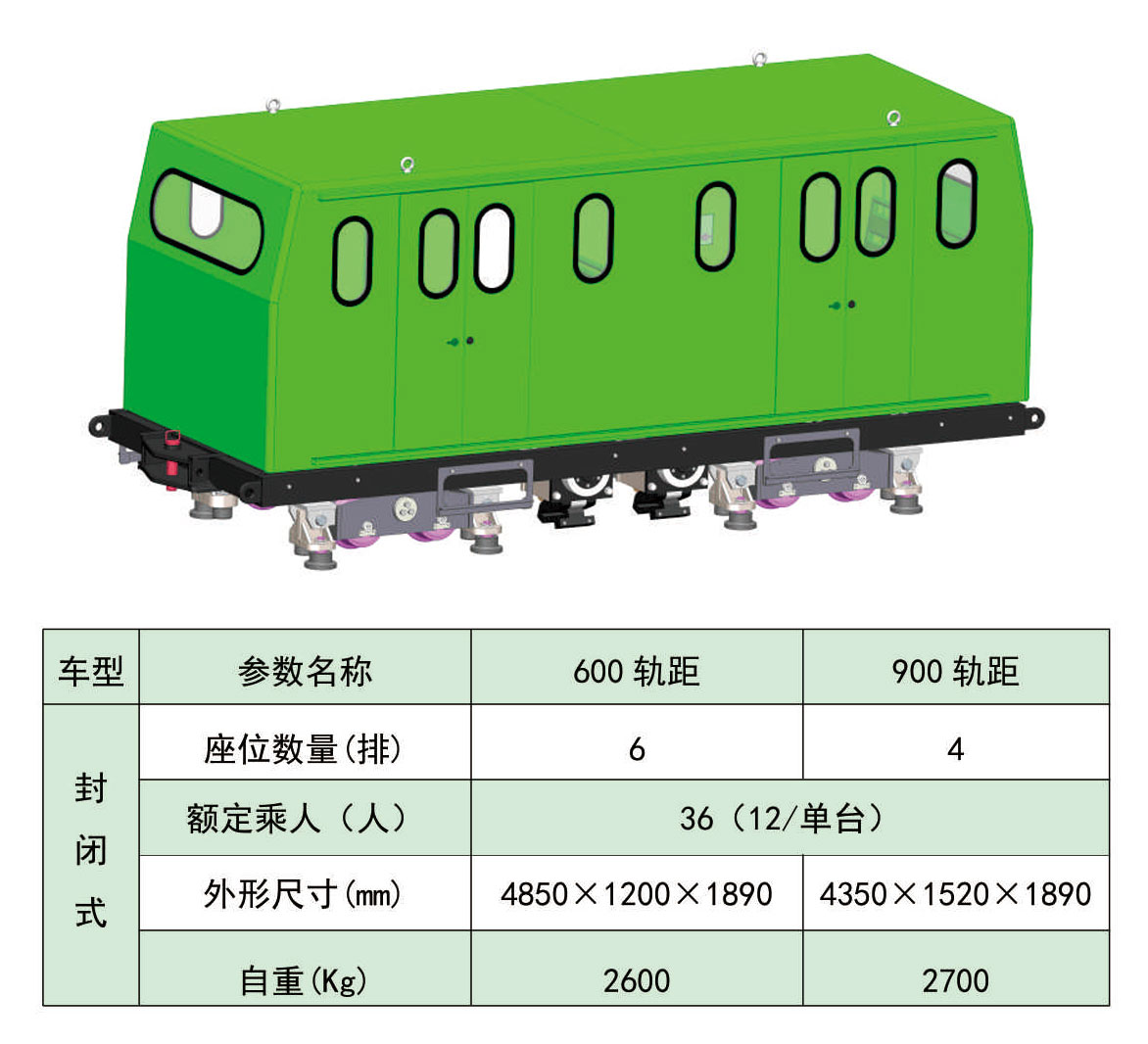 卡軌車乘人車主要為人員乘坐車廂,車架連有轉向架和減震器,能夠更好保證乘人車平穩(wěn)、順暢的通過水平彎道、起伏坡道及陰陽軌等工況,可滿足最小水平轉彎半徑9m,最小垂直轉彎半徑15m的軌道運行。根據結構形式分為半敞式和封閉式。