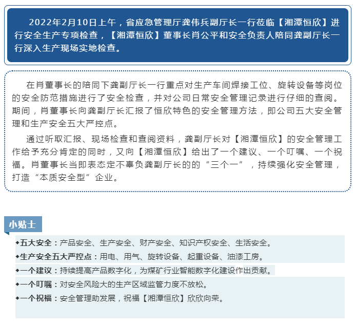 xiao12666@163.com省應(yīng)急管理廳龔偉兵副廳長帶隊(duì)蒞臨【湘潭恒欣】檢查企業(yè)復(fù)工復(fù)產(chǎn)安全防范工作