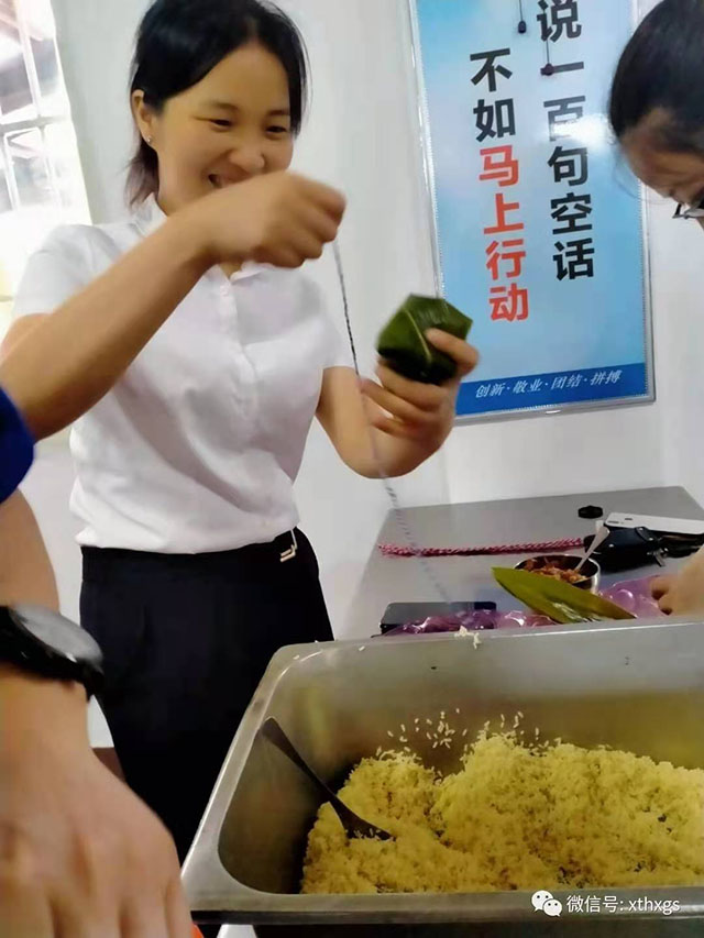 本次比賽共分為21組,每組4人,角逐"數(shù)量最多獎(jiǎng)”和“最美粽子獎(jiǎng)”。比賽前,進(jìn)行了關(guān)于端午節(jié)相關(guān)知識(shí)及【中國(guó)銀行】和【湘潭恒欣】企業(yè)文化知識(shí)搶答。隨著【中國(guó)銀行】周行長(zhǎng)吹響比賽口哨,活動(dòng)氣氛高漲,平時(shí)在車(chē)間搬鐵動(dòng)械、在家翹著二郎腿的大老爺們也開(kāi)始像模像樣地“捉粽子”了;上得廳堂、下得廚房的女士們輕松地包了一個(gè)又一個(gè)有棱有角粽子。雖然比賽只有十分鐘,但速度可不慢,最快的一組共包了40多個(gè)粽子哦?!鞠嫣逗阈馈客聜冋f(shuō)往年都是買(mǎi)粽子吃,今年可以吃到自己親手包的粽子,感覺(jué)特別好,特別幸福,印證了習(xí)大大的金句:“幸福是奮斗出來(lái)的”。
